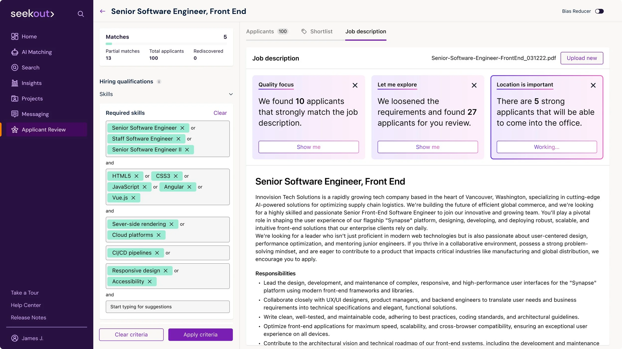 Seekout: Applicant Review Seekout: Smart Recommendations Hackathon SeekOut: Messaging Seekout: Skills System